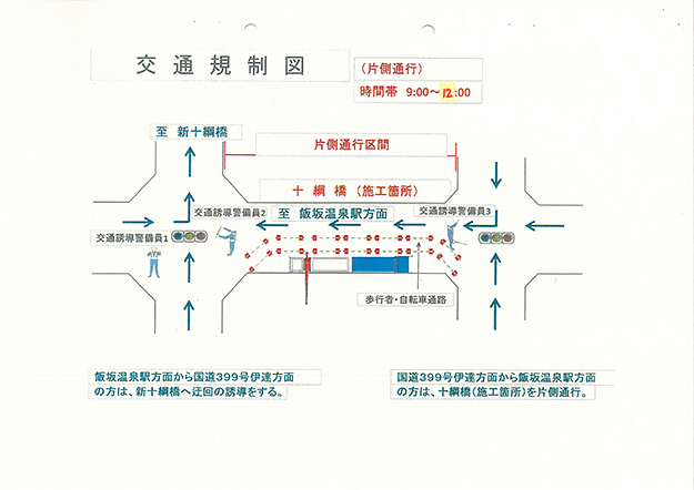 飯坂温泉駅前の十綱橋は、補修工事に伴う調査のため、片側通行止めの交通規制が実施されます。 日時:令和7年12月8日 9:00~12:00まで(予定) 規制内容:十綱橋は国道399号伊達方面から飯坂温泉駅方面への片側通行となります。 飯坂温泉駅方面から国道399号伊達方面に向かう方は、新十綱橋をご利用ください。 詳しくは、位置図、交通規制図をご覧ください。