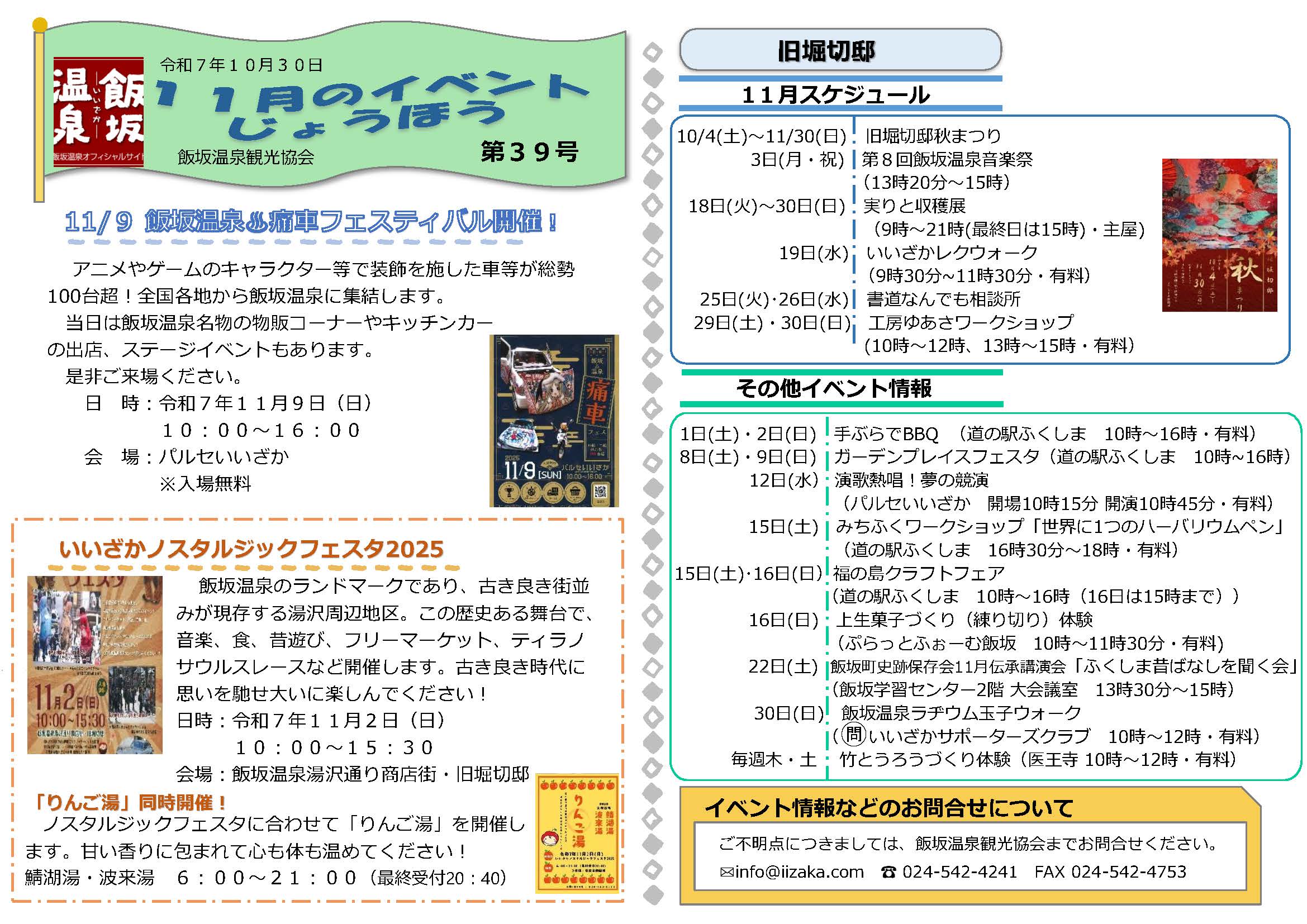 | 17日(日) | いいざかノスタルジックフェスタ ・むかしあそびけん玉教室 (10:00~15:00) ・芋煮無料振る舞い (12:00~ なくなり次第終了) |