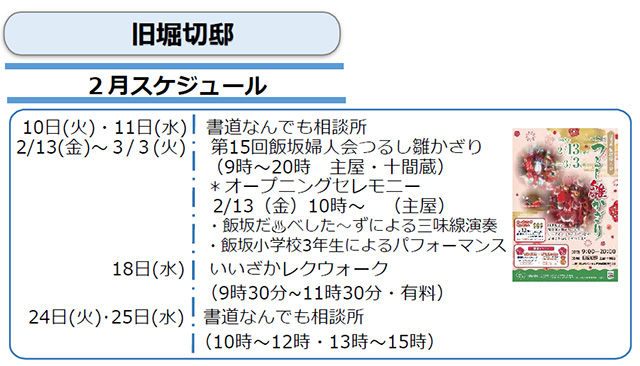 旧堀切邸2月スケジュール 10日(火) 11日(水) 書道なんでも相談所 13日(金)~ 3月3日(火) 第16回飯坂婦人会つるし雛かざり (9:00~20:00 主屋・十間蔵) ※オープニングセレモニー 2月13日(金)主屋にて10:00~ ・飯坂だべした~ずによる三味線演奏 ・飯坂小学校3年生によるパフォーマンス 18日(水) いいざかレクウォーク (9:30~11:30・有料) …続きを読む