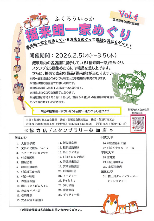 【福来朗一家めぐり】 福来朗一家を展示しているお店をめぐって素敵な賞品をゲットしてください!! 開催期間:令和8年2月5日(木)~ 3月5日(木) 飯坂町内の各店舗に展示している「福来朗一家」をめぐり、スタンプ5個集めた方には粗品を差し上げます。 さらに、抽選で素敵な賞品(福来朗)が当たります♪ ※同一展示場所のスタンプが集まった応募用紙は無効になります。 ※粗品は協力店全店でお渡し可能です。 ※ …続きを読む