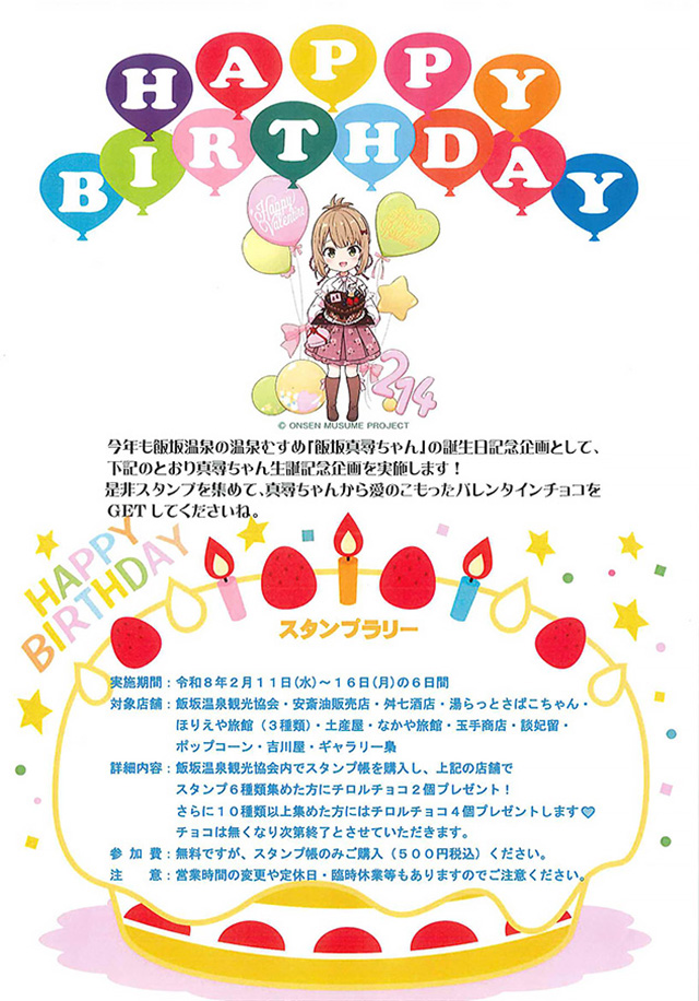 飯坂温泉の温泉むすめ【飯坂真尋ちゃん】の誕生記念企画を実施します!! スタンプを集めて、真尋ちゃんから愛のこもったバレンタインチョコをGETしてください! 期間:令和8年2月11日(水)~ 16日(月) の6日間 内容:飯坂温泉観光協会内でスタンプ帳を購入し、対象店舗でスタンプ6種類集めた方にチロルチョコ4個プレゼントします。 チョコは無くなり次第終了とさせていただきます。 参加費:無料! スタン …続きを読む
