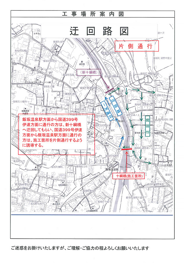 工事に伴い十綱橋は、湯野側から飯坂温泉方面への片側通行となります。
