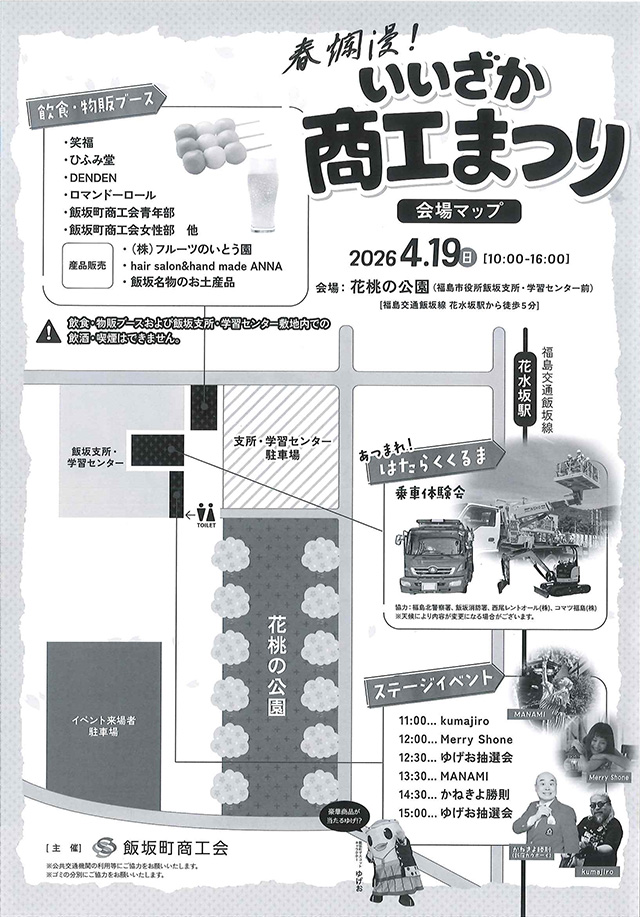 春爛漫!【いいざか商工まつり】 食べて、遊んで。春の飯坂を満喫する一日。 入場無料!! 日にち: 2026年4月19日(日) 時間: 10:00~16:00 会場: 花桃の公園(福島市役所飯坂支所・学習センター前) 飲食・物販ブースの他、はたらくくるま乗車体験会も!! ステージイベントもあるよ!!! 主催: 飯坂町商工会 〒960‐0201 福島市飯坂町筑前12-1 (荒天中止)