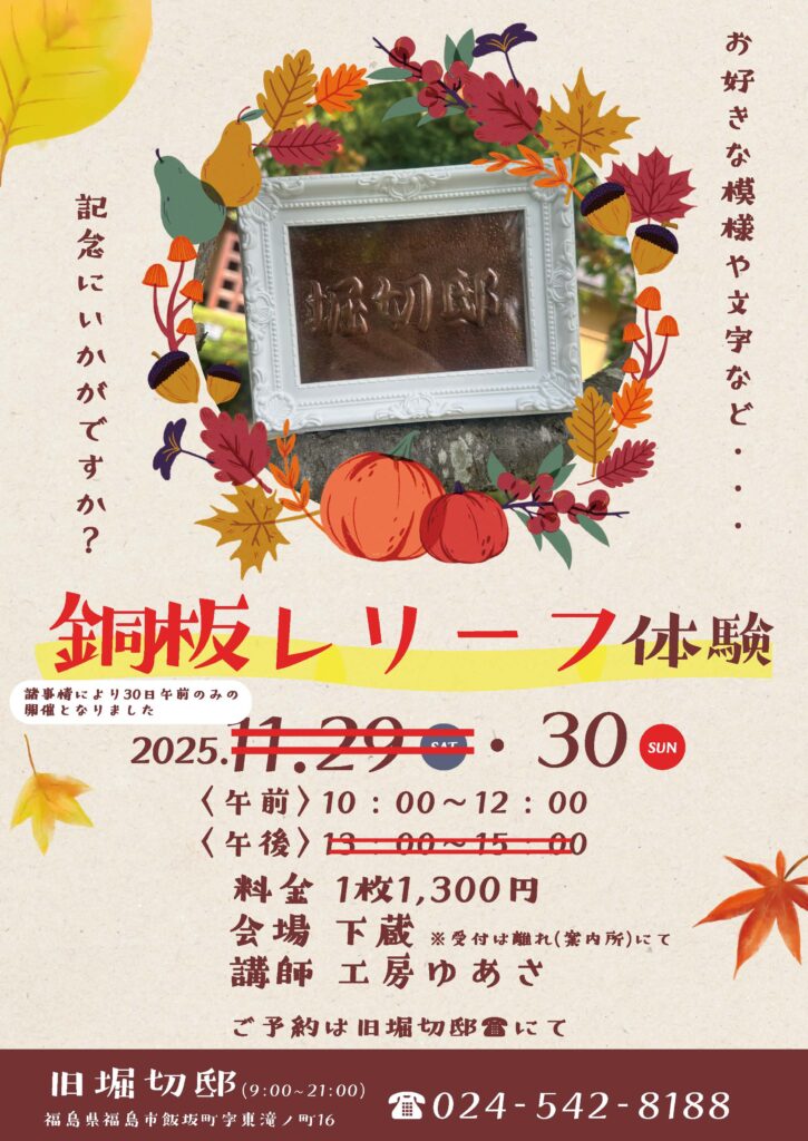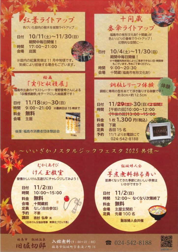 【いいざかレクウォーク】 毎月第3水曜日開催!! 旧堀切邸を拠点に飯坂温泉の四季折々の風景を楽しみながら歩くイベントです! 講師の説明を聞きながら、古き良き温泉街の飯坂をより深くお楽しみいただけます! 1回だけの参加も大歓迎! 日にち:毎月第3水曜日(11月は19日) 時間:9:30~11:30 事前申し込み制 定員:各回15名 参加費:各回500円(保険代・資料代・水代含む) 集合場所:旧堀切邸 …続きを読む